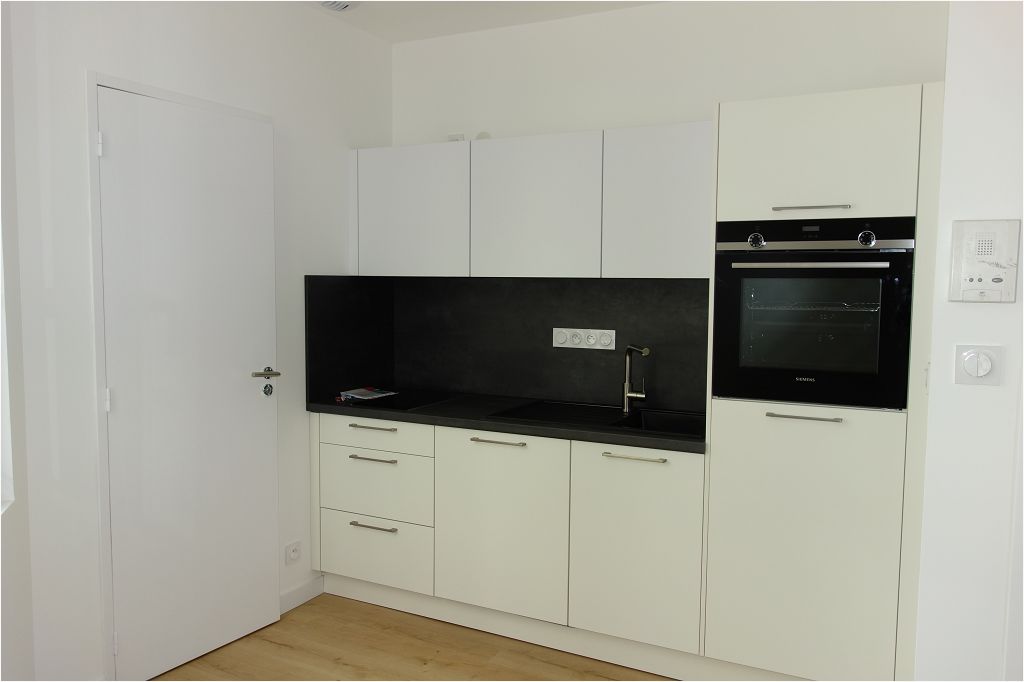 cuisine ouverte aménagée équipée (four, hotte, plaques, frigo, LV), une chambre avec placard, salle d’eau avec wc, cave,