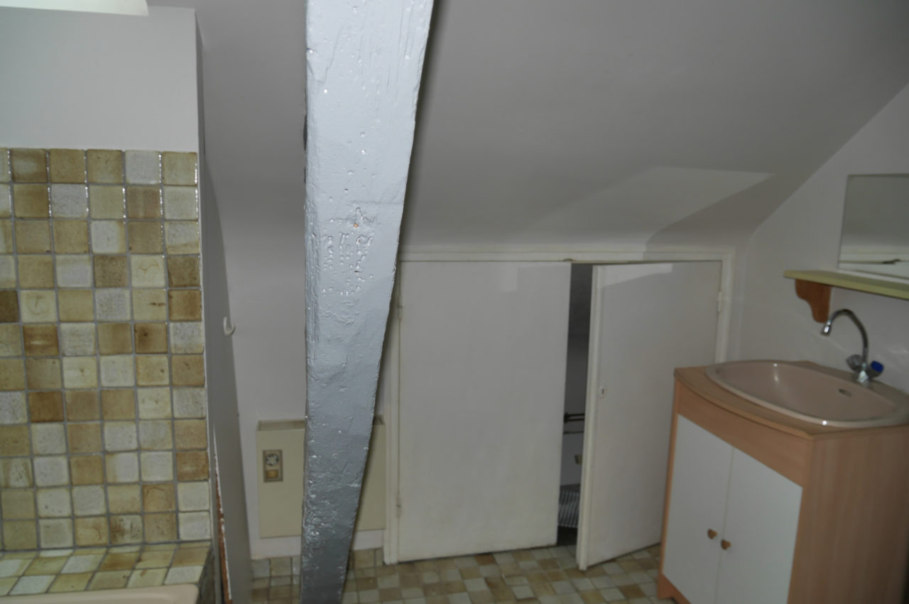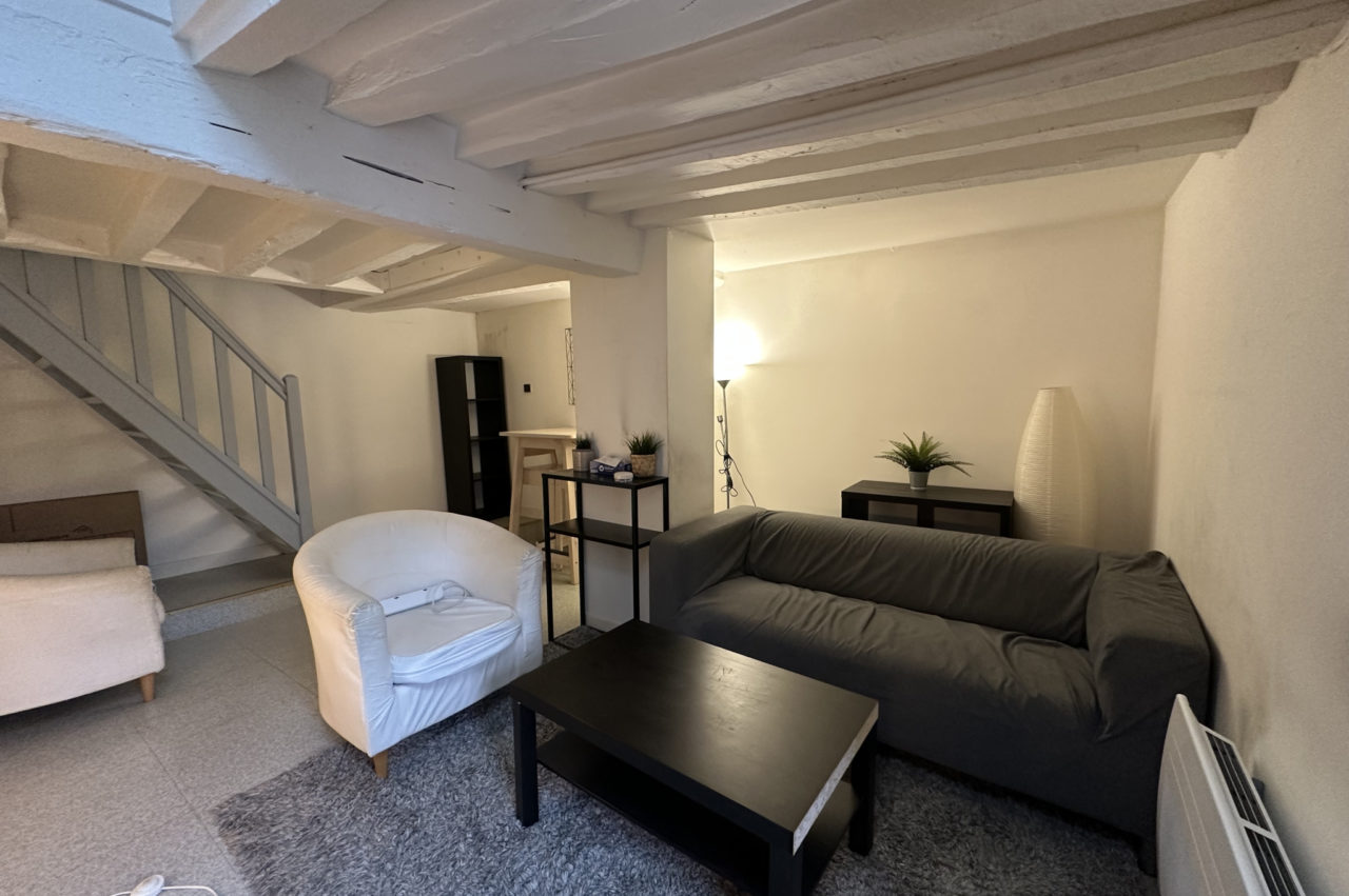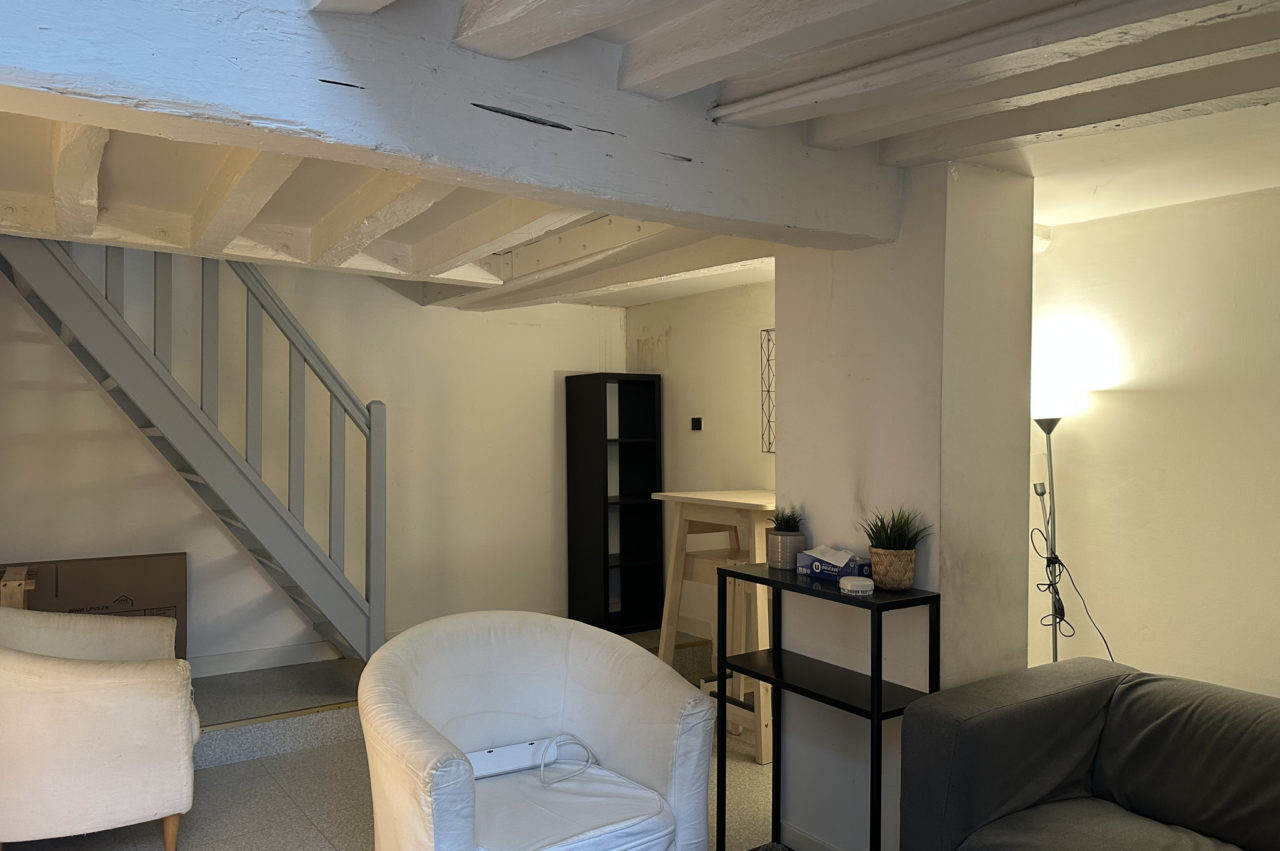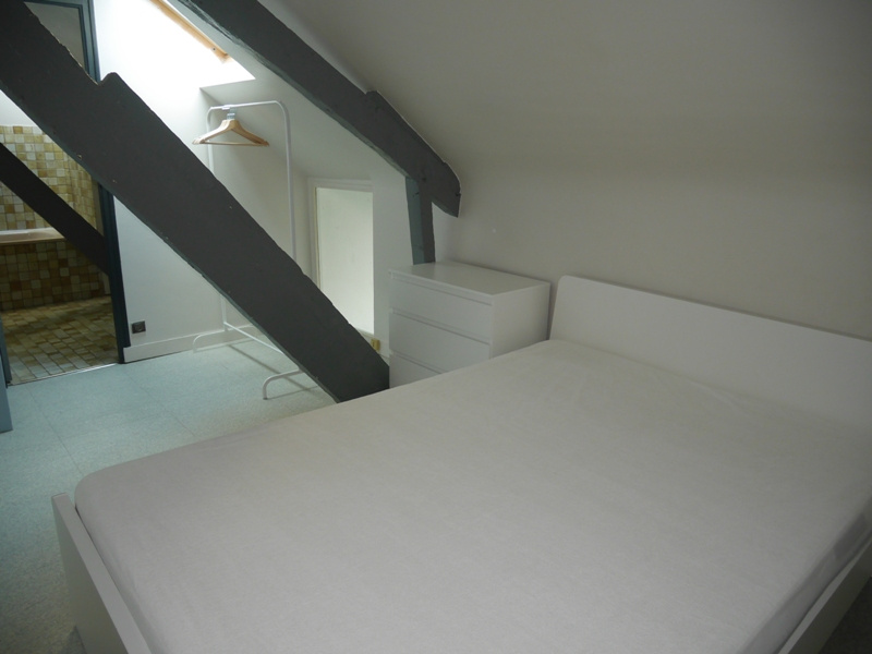 EXCLUSIVITE RENNES CENTRE HISTORIQUE. Dans immeuble ancien, APPARTEMENT T2 DUPLEX de caractère situé au dernier étage comprenant : entrée, séjour avec poutres, cuisine équipée séparée, wc. A l’étage une chambre, plards et salle de bains attenante.