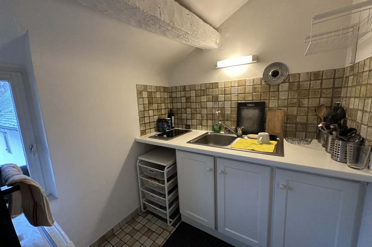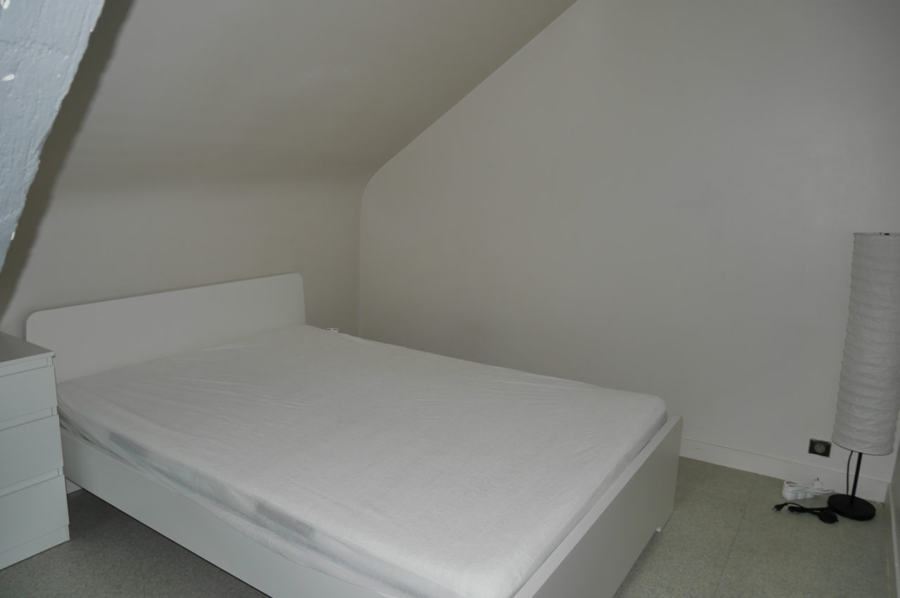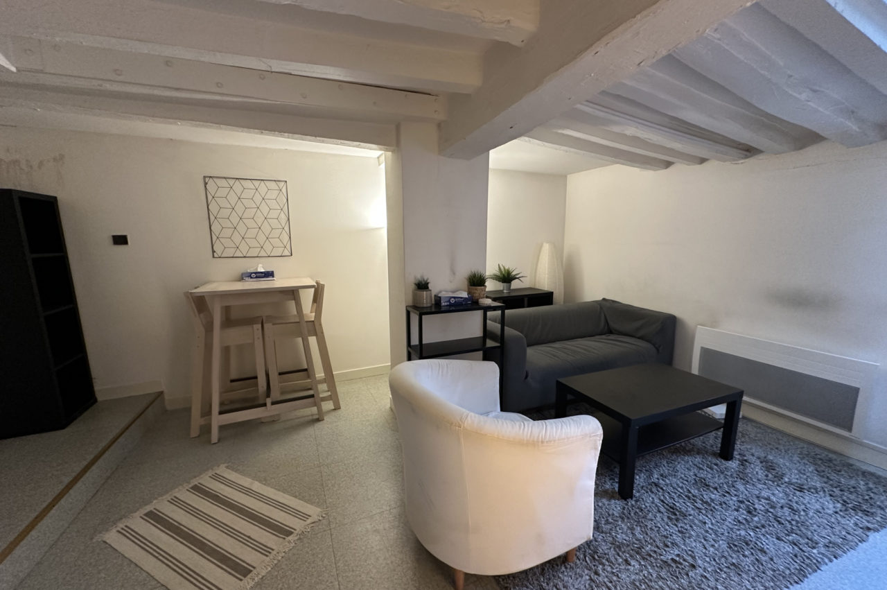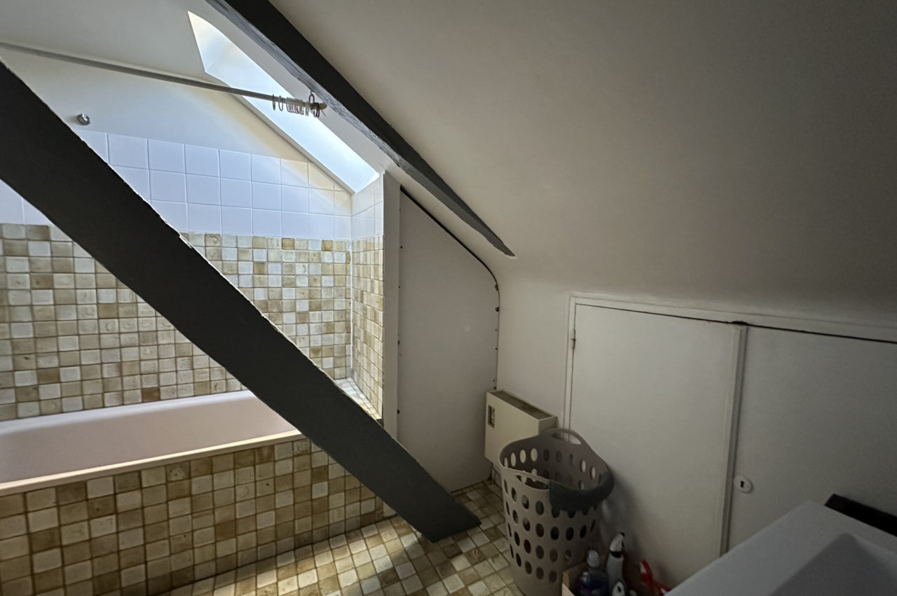 EXCLUSIVITE RENNES CENTRE HISTORIQUE. Dans immeuble ancien, APPARTEMENT T2 DUPLEX de caractère situé au dernier étage comprenant : entrée, séjour avec poutres, cuisine équipée séparée, wc. A l’étage une chambre, plards et salle de bains attenante.
